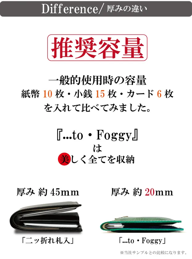 キャッシュレス時代と言われる昨今、カードを携帯する事は現金を携帯する事と同等に必須になってきています。ただ、カードもその時々によって携帯する枚数も種類も異なります。従来の財布は沢山カードを入れておくとその厚みが記憶されてしまい、枚数を少なくした際にブカブカになって上手く収納出来ない経験をお持ちの方は少なくないと思います。この『...to・Foggy(フォギー)』はカードの枚数によってカードスペースが可動し、常にホールド(特許庁意匠登録出願中)するのです。