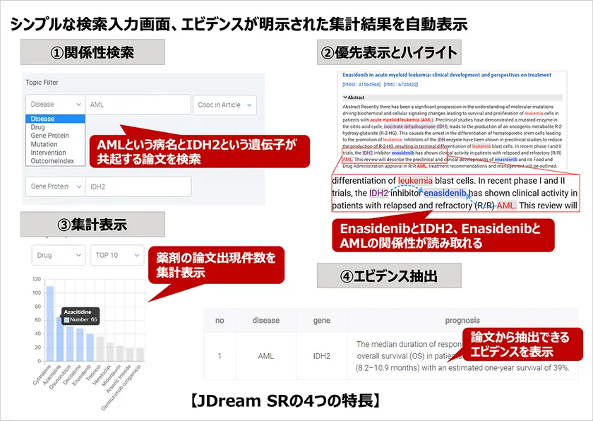 疾患名や遺伝子名を入力するだけで、国内外の医学薬学データベースに収録されている4,000万件以上の論文情報から、AIを使って関連する論文をユーザーの目的に応じて優先度を付けて表示、必要な情報を自動集計するなどして、遺伝子変異の臨床的意義の推定や最適な治療の選択、医薬品の費用対効果の評価に必要なエビデンスの抽出を支援します。