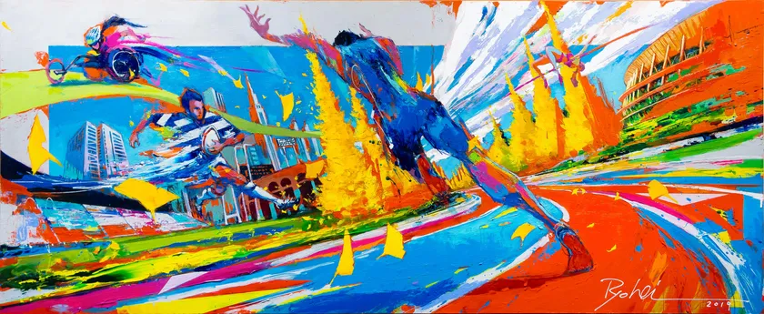 「躍動」を一貫したテーマに絵画作品を制作。代表作はサムライシリーズやスプリンターシリーズ。コマーシャルアートの分野では有名フィットネス誌表紙をはじめ、世界的スポーツブランドなどスポーツやアスリートに特化したビジュアルを作成、音楽フェスでのライブペインティング、参加者3万人規模のマラソン大会公式ビジュアルなどを手がけています。2010年に自身のアートブランドを立ち上げ作品の発表、販売を開始。2015年、大阪で開催されたアジア規模のアートフェアではスポンサー賞を受賞し、エンターテインメント系現代絵師としての道を開拓中です。