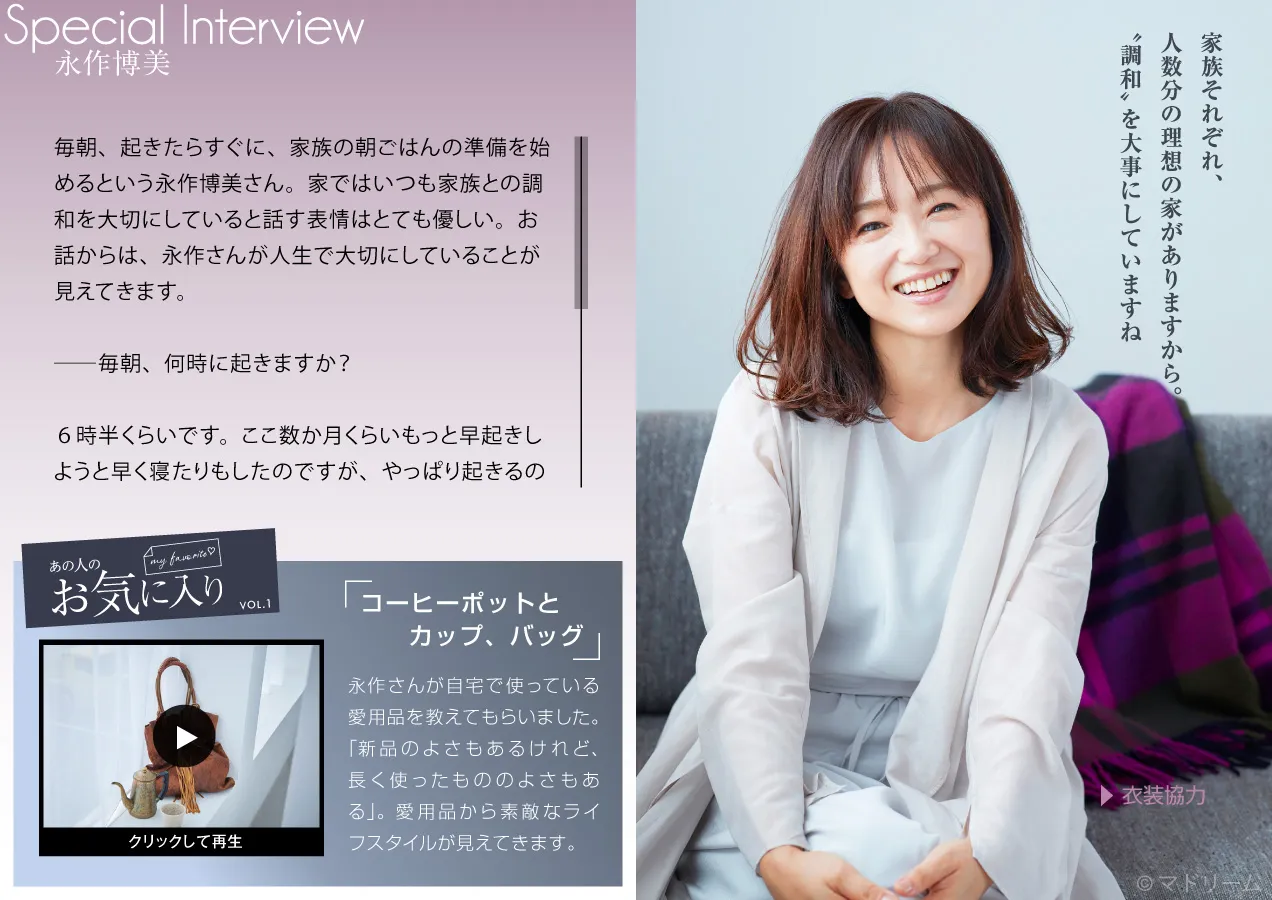 最新号には女優の永作博美さんが登場、毎朝の過ごし方や家族との暮らしについて伺います。また、10月23日(金)全国ロードショーの主演映画『朝が来る』の公開を記念したスペシャルインタビューも。タイトルに込められた意味や、役作りについてお話しいただきました。また、普段使っている愛用品についての動画企画もスタート。お気に入りを大切にする暮らしぶりを伺いました。