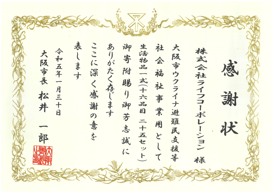ライフコーポレーションでは、「大阪市ウクライナ避難民支援」に関して、大阪市より感謝状を受領いたしました。当社は、ウクライナからの避難者の方々への支援として、布団やタオル、食器などの生活物品一式を2022年12月に提供しております。