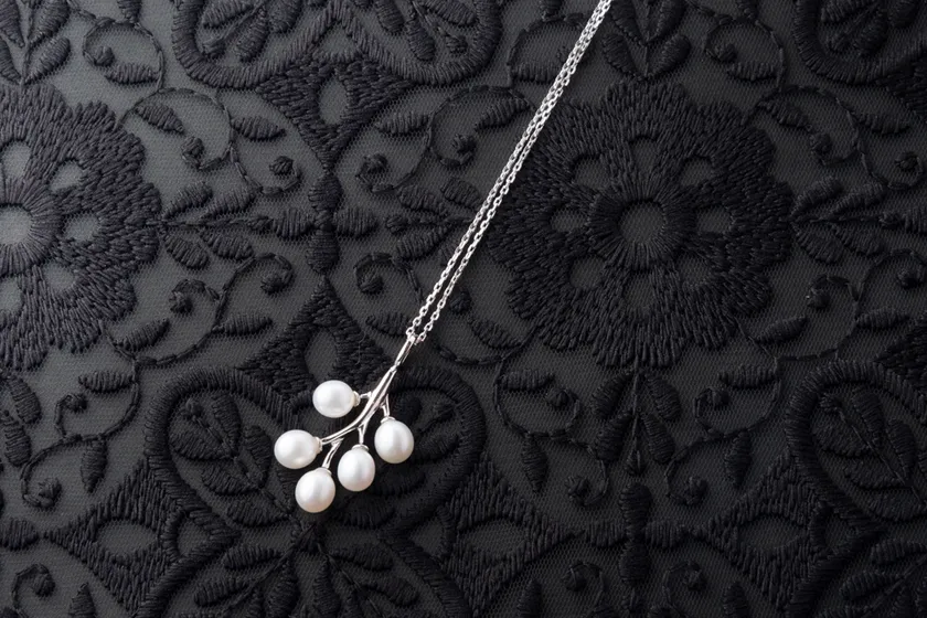満開の花と実る果実をイメージした淡水パールは自然の恵みを享受する縁起の良いデザインです。5つの淡水真珠が果実のようにデザインされたボリューム感がとても魅力的です。それぞれの淡水真珠の輝きが胸元で存在感を放ちます。