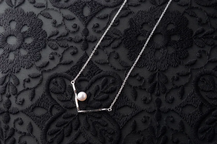 一粒の朝露のようにシルバーの上に添えられたアコヤ真珠の艶めきがモダンなペンダントです。モダンなフォルムに一粒のパールを添えたシンプルなデザインが装いのポイントになり、更にデコルテを美しくみせるV字のデザインとなります。