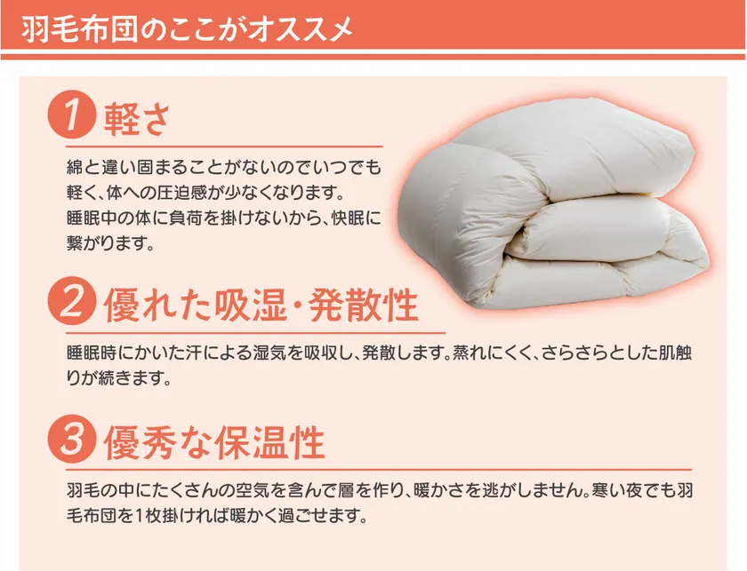 軽くて暖かい羽毛本来の軽さとぬくもりをお楽しみいただける商品です。