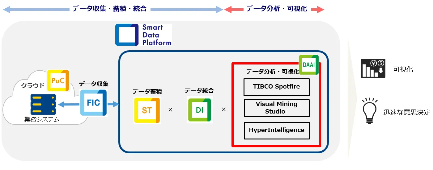 「Visual Mining Studio」「TIBCO Spotfire」「HyperIntelligence」は、データ分析・可視化機能として「SDPF」を構成します。「SDPF」の詳細については、下記ウェブサイトをご参照ください。