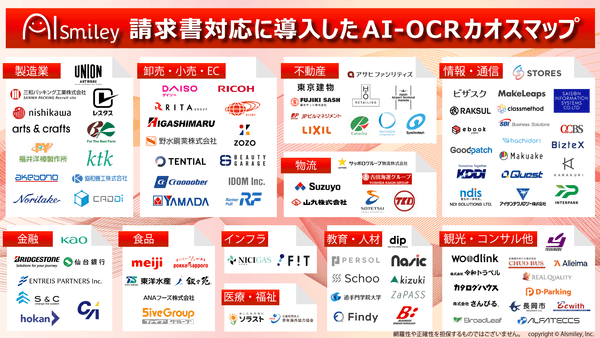 企業のDXを推進する国内最大級のAIポータルメディア「AIsmiley」を運営するアイスマイリー(東京都渋谷区、 代表取締役:板羽晃司)は、電子帳簿保存法への対応や、請求書業務における業務効率化支援の一環として「請求書対応に導入したAI-OCRカオスマップ」を2023年2月15日に公開いたしました。掲載数は合計で100事例になります。