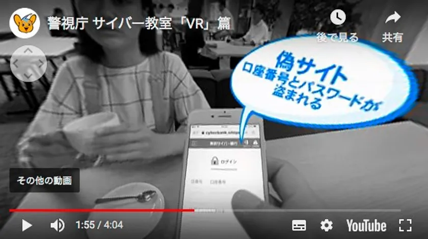 警視庁では10月5日より都民に向けて、専用のヘッドセットを使わずにスマートフォンやWebブラウザ上で、いつでも・どこでも・手軽にフィッシング詐欺被害を疑似体験することができるVRムービーを公開しています。また、10月15日から、フィッシング詐欺被害を紙芝居風の演出で誰にでも分かりやすく解説した「小島よしおのサイバーセキュリティ教室・フィッシング詐欺ってなに?編」の動画を新たに公開いたします。