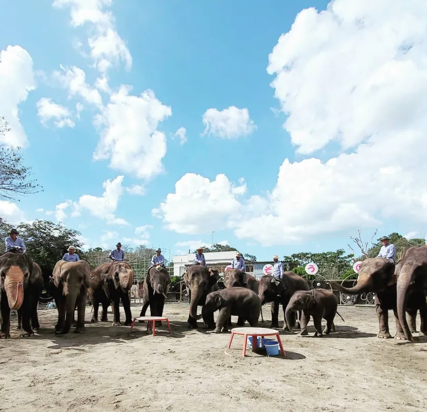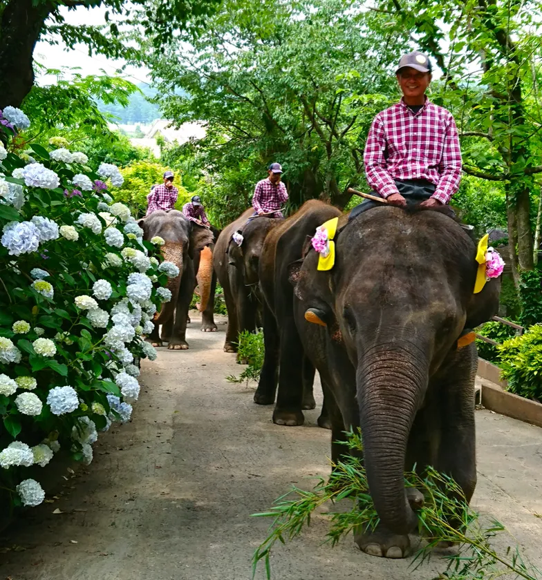 「市原ぞうの国」では、1歳から42歳のゾウ12頭のお世話をしていただくために、タイから18名のゾウ使いに来ていただき、一緒に暮らしています。「日本一多くのゾウが暮らす動物園」として、お子さまから大人まで多くのお客様にお楽しみいただいています。当園では開園以来、ゾウをはじめとした動物たちとお客様が身近に接することに強い想いを持っています。国内初のゾウの自然繁殖に成功できたのも、“動物が楽しく暮らせる環境づくり”や、“タイのゾウ使いとゾウとの関係”に象徴される動物と人との関係にこだわってきたからです。