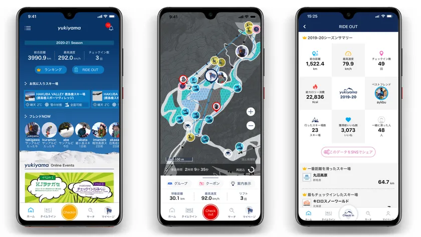 yukiyamaは、これ1つのアプリで全国のスキー場どこでもチェックインして利用する事のできる、【GPSマップ&ログ取得】のアプリであり、その前後で情報を取得・発信したり、体験をシェアするなど、今までに出来なかったことを、ITによって可能にしました。