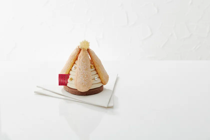 ミルクチョコレートでコーティングしたサブレのうえにのったクリスマスツリーケーキは、アールグレイ風味のクリームを搾って形作られ、仕上げにビスキュイキュイエールとパールショコラを飾りました。ツリートップにはホワイトチョコレートで作った星が配されています。ケーキの中身は、メレンゲ、みかんゼリー、栗のはちみつを使ったマロンムースを層にして忍ばせました。みかんゼリーの酸味と栗のはちみつの暖かみのある自然な甘みと、それらをまとめるアールグレイ風味のクリームが絶妙のバランスです。また、サブレのクランチー感、みかんゼリーやマロンムースのなめらかさ、ビスキュイのソフトな歯ごたえなど、異なる食感もお楽しみいただけます。