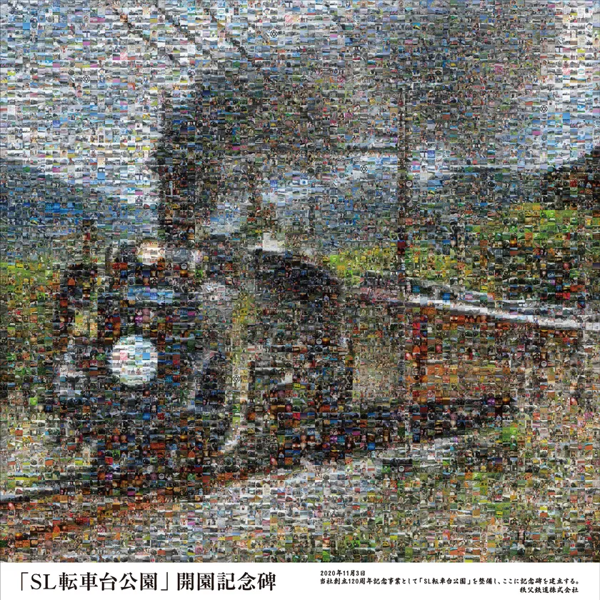 SL転車台公園は、老朽化により解体撤去した鉄道車両公園の跡地を利用し、当社創立120周年記念事業として2019年より整備を進め、この度、正式オープンとなります。公園のテーマは「地域の自然と鉄道の調和」であり、SL転車台を中心に樹木、芝生、遊歩道を配置する設計としています。公園開園記念として、フォトモザイクアート記念碑を制作、建立いたしました。フォトモザイクアートはお客様から募集した思い出の写真などを基に、SLパレオエクスプレスを表現しております。