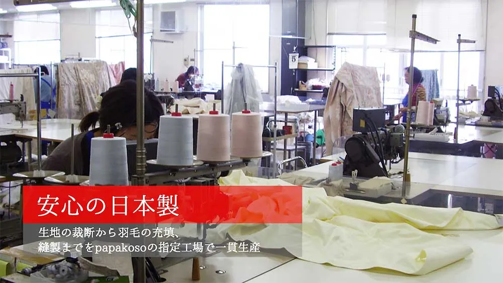 「つながる布団」は生地の裁断から、羽毛の充填まで日本国内のpapakosoの指定工場にて一貫生産します。使用する羽毛原料は、指定工場が出資する合弁農場で採取される羽毛のみを使用。中身が見えない布団だからこそ、「生産地がわかる羽毛原料」と「確かな品質で生産できる環境」を整えています。