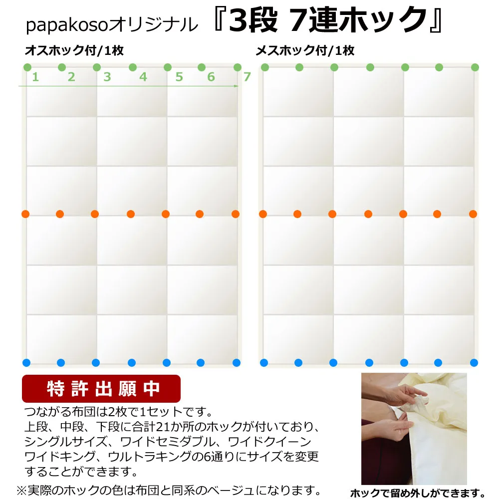 2枚の布団に付属する【3段7連ホック】を組み合わせ、使う人数や子どもの成長、寝室環境にあわせてベストなサイズでお使いいただけます。