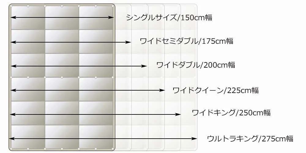 オリジナルの【3段7連ホック】がシングルサイズからウルトラキングサイズまでの6通りのサイズ変更を可能にします。