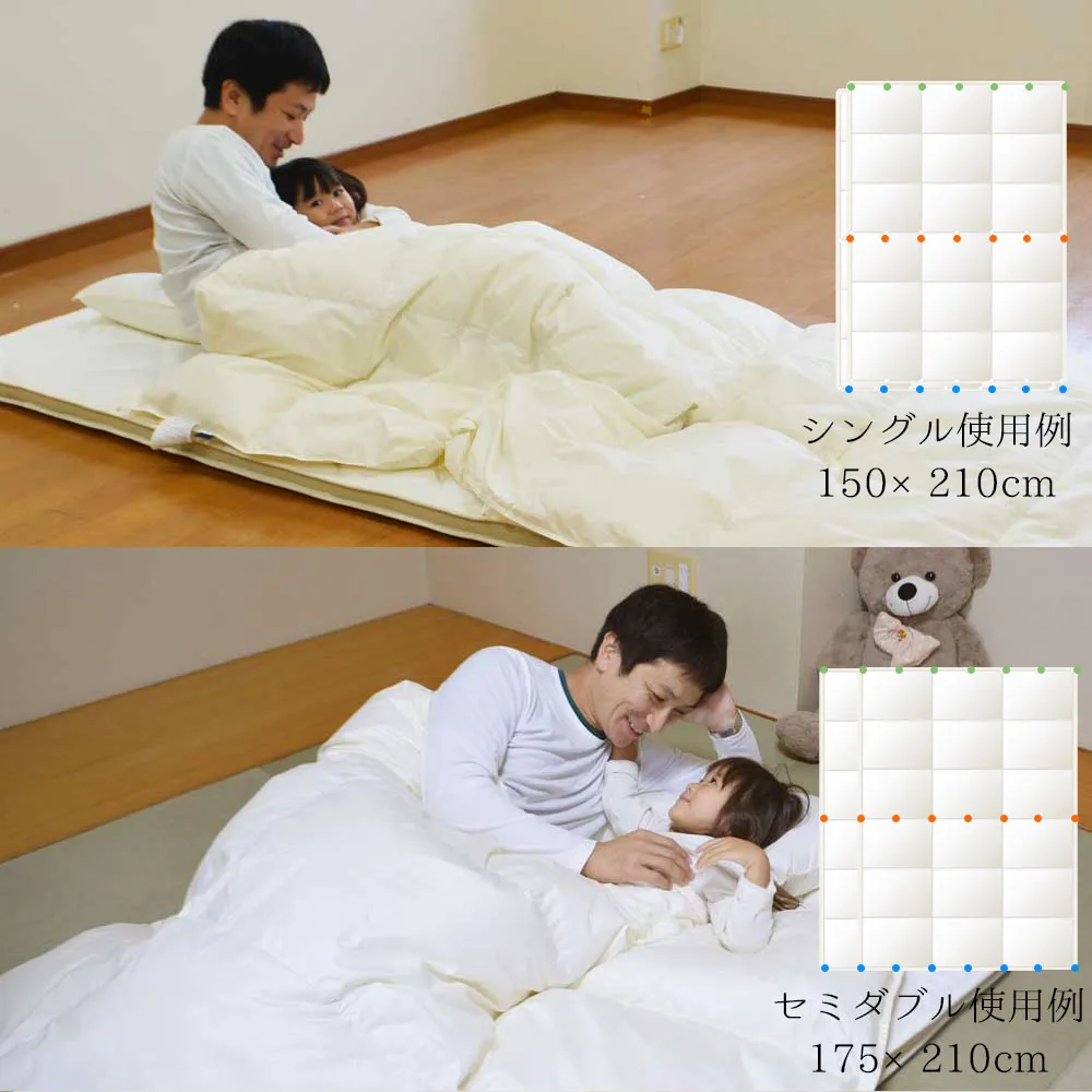 | セット内容 | つながる布団 シングルサイズ 2枚セット (1枚はオスホック付属、もう1枚はメスホック付属) サイズ:150cm×210cm シングルロングサイズ2枚組 詰め物重量:300g/1枚 |