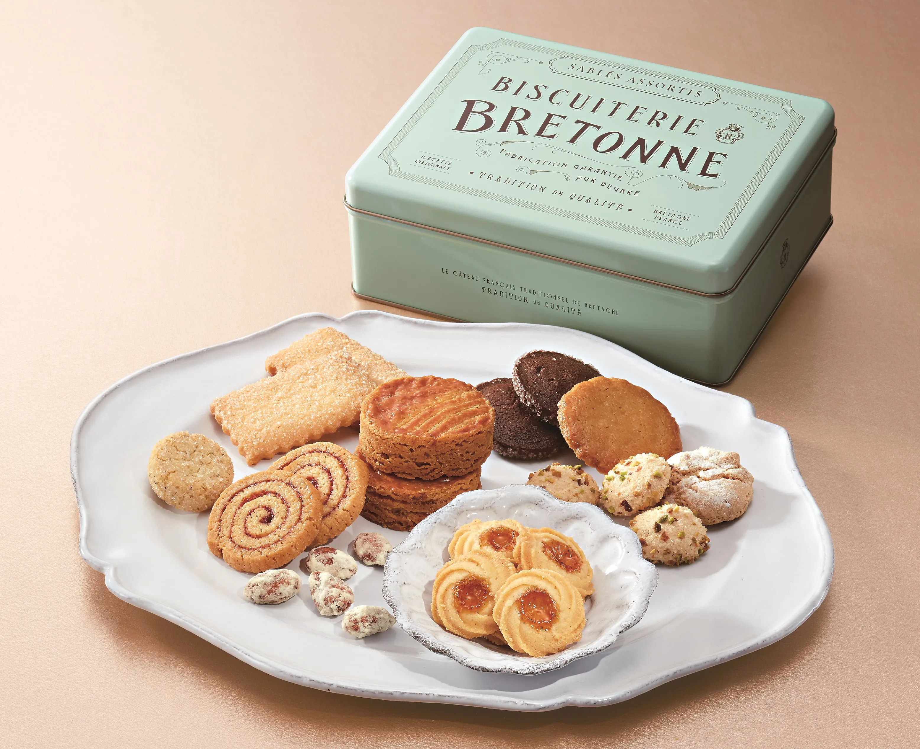甘酸っぱいアプリコットのコンフィチュールをしぼったサブレと、ゲランドの塩をアクセントに、糖衣がけしたアーモンド菓子。2種類の特別な美味を、発酵バターの風味が広がるフランス・ブルターニュの郷土菓子、ガレット・ブルトンヌなど人気のクッキー8種類とともに詰めた限定アソート缶です。