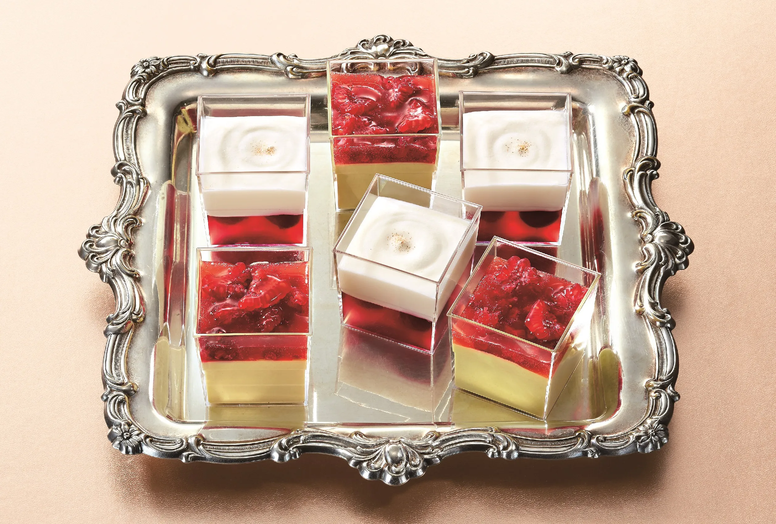 コク深いピスタチオムースには、フランボワーズとベリーのジュレをマリアージュ。酸味が爽やかなグリオットチェリー入りのゼリーには、濃厚なホワイトチョコのムースをあわせました。あたたかなお部屋でいただくにふさわしい、彩りも美しいデザートは、冬の記念日にも喜ばれる美味です。