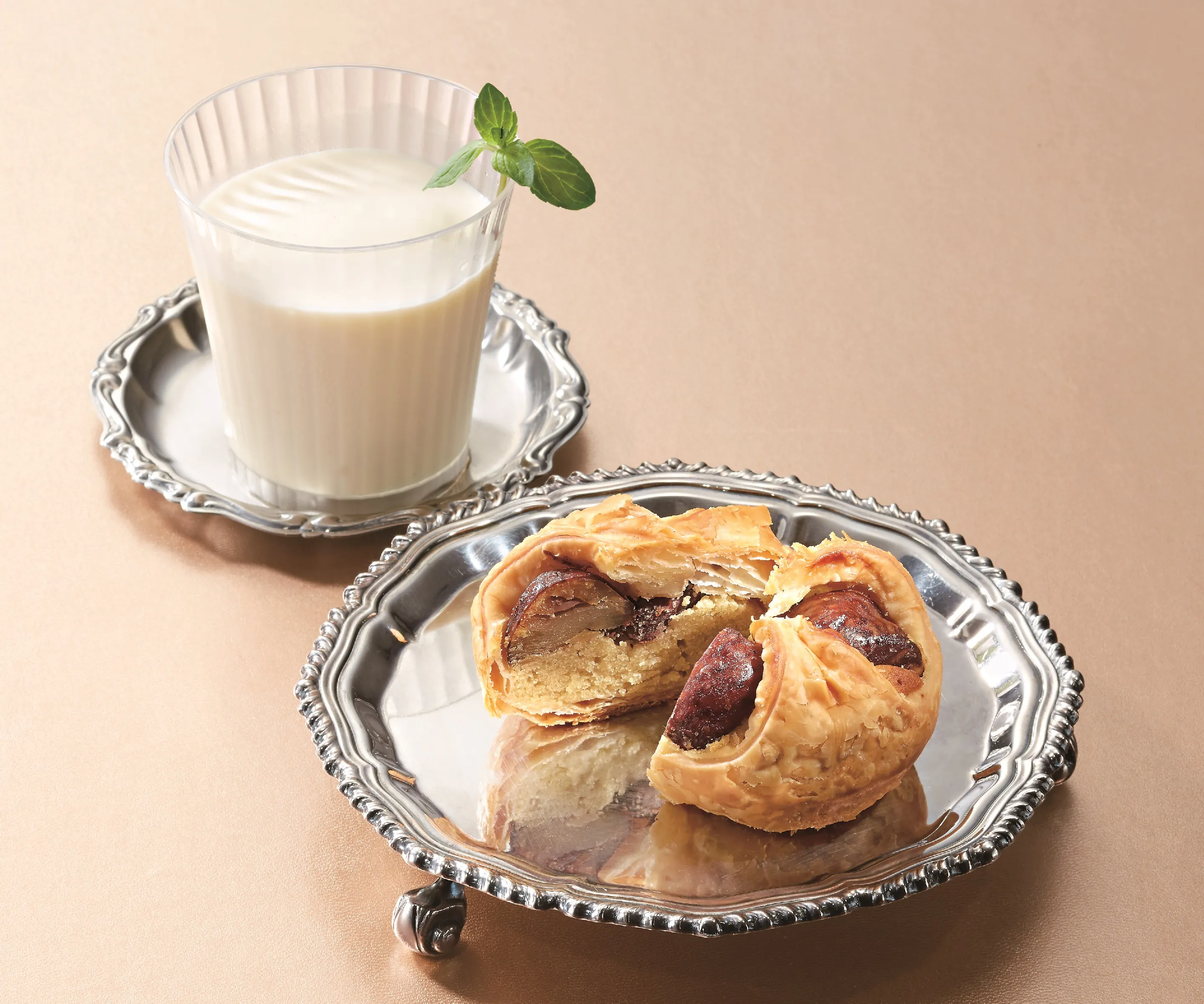 茨城県産栗のペーストとアーモンドクリームを組み合わせ、熊本県産の栗の渋皮煮を加えてパイ生地でつつんで焼き上げたマロンパイ。北海道産生クリームとマダガスカル産バニラの濃厚な味わいが自慢の<京橋千疋屋>オリジナルアイスクリームとのセットです。