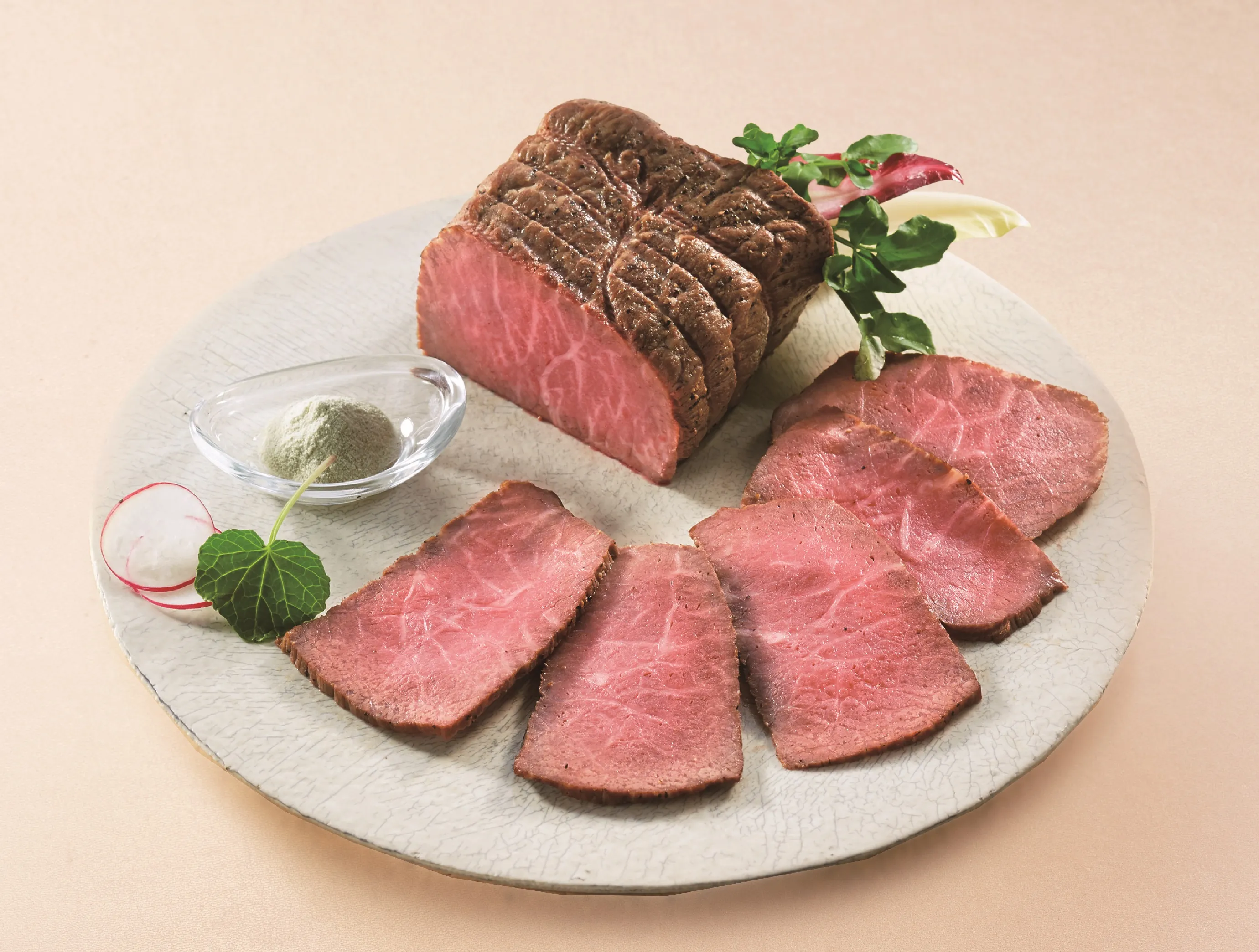 赤身のうまみ成分を豊富に含み、やわらかな肉質が自慢のくまもとあか牛。その肉本来の味わいを生かすために、塩と胡椒だけで仕上げ、伊豆天城産のわさびを使ったわさび塩を添えました。バイヤーが吟味を重ねた旨さです。