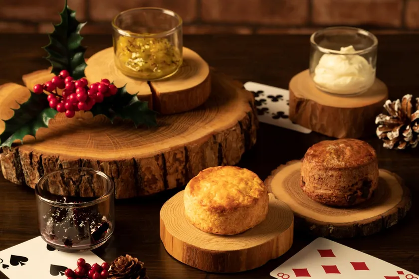外はカリカリ、中はしっとりとしたプレーンスコーンとチョコレートチップスコーンを用意しました。カカオ71%で深くローストされたナッツのような香ばしさが特徴のチョコレートを使用し、ジャムとの相性は抜群です。クレームドゥーブルのほか、フレッシュなキウイをシャンパンに漬けこんだ「キウイとシャンパンジャム」、6種類のベリーを使用した「ミックスベリージャム」をお楽しみいただけます。
