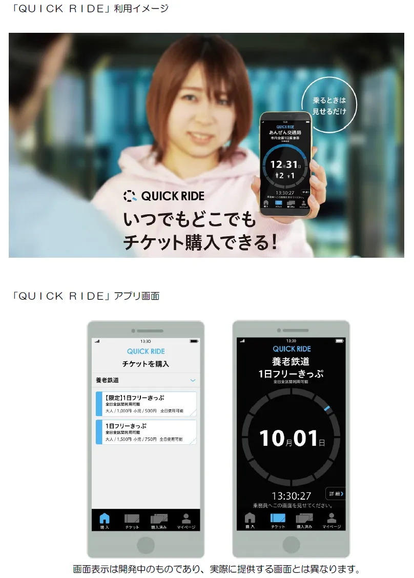 「QUICK RIDE」を利用することで、「養老鉄道1日フリーきっぷ」が、いつでもどこでも購入できるようになります。また、より多くの方に知っていただくため、同日より「養老鉄道1日フリーきっぷ(モバイル版)お試しキャンペーン」を実施します。