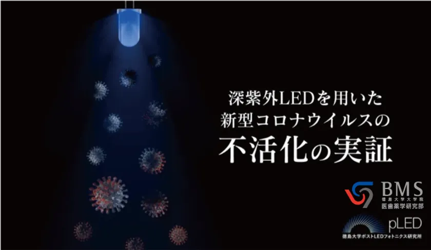 徳島大学 大学院医歯薬学研究部(所在地:徳島県徳島市、研究部長:苛原 稔、以下:BMS)及び 徳島大学 ポストLEDフォトニクス研究所(所在地:徳島県徳島市、所長:安井 武史、以下:pLED)による共同研究チームは、新型コロナウイルス(SARS-CoV-2)の不活化(不活化度99.9%以上)と不活化に必要な深紫外(しんしがい)光量の定量化に成功したと同時に、液中や空気中などのあらゆる環境に応用可能な不活化基礎データの取得に成功したことをお知らせします。これにより、例えば新型コロナウイルス不活化装置を製品化した際の性能評価根拠を提供することができます。