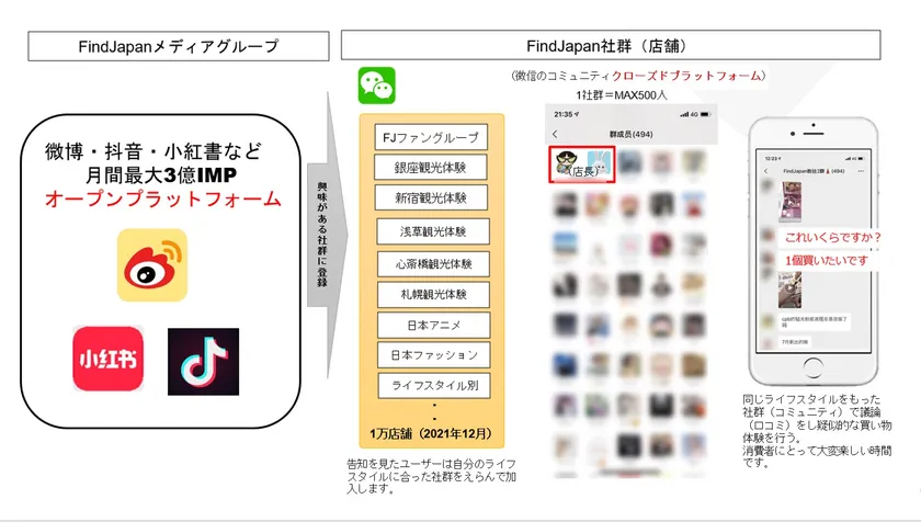 130万人以上のフォロワーがいる、FindJapanの中国SNSアカウントで、“例:浅草の浅草寺へ行く”と告知し、観光疑似体験をしたいフォロワーを、FindJapanが用意したWeChatのグループチャット(以下:社群)へ誘導し社群を形成します。商業施設でも同様。(2021年12月には1万社群、300万人以上の利用者を目標に事業を進めております)