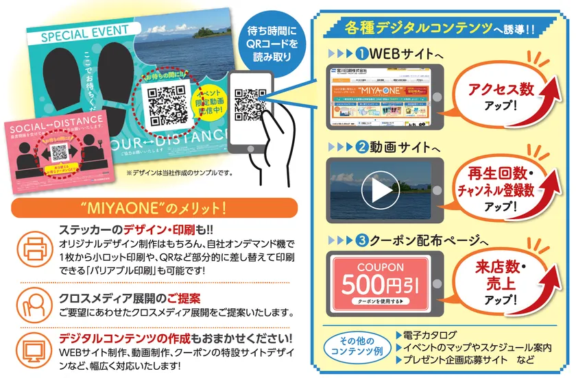 印刷の枠にとどまらず、あらゆる業種のお客様に販売促進の企画からデリバリーまで、トータルで提案する「ワンストップサービス展開」を行う宮川印刷株式会社(所在地:滋賀県大津市、代表取締役:宮川 佳嗣、1912年創業)はこの度、コロナ不況と戦う企業、店舗に向け今年5月より展開している新型コロナ対策特化型ワンストップサービス『MIYAONE(ミヤワン)』での取り組みの一つとして、ソーシャルディスタンスステッカーやマスクケース等のコロナ対策グッズにWEBサイトや動画等のデジタルコンテンツを連動させ、「メディア化」することで非接触でのアプローチ力を高める販促ツールの展開を開始いたしました。