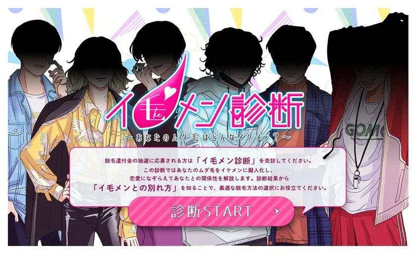 この診断ではユーザーのムダ毛をイケメンに擬人化し、恋愛になぞらえてユーザーとの関係性を解説します。診断結果から「イ毛メンとの別れ方」を知ることで、最適な脱毛方法の選択にお役立てください。