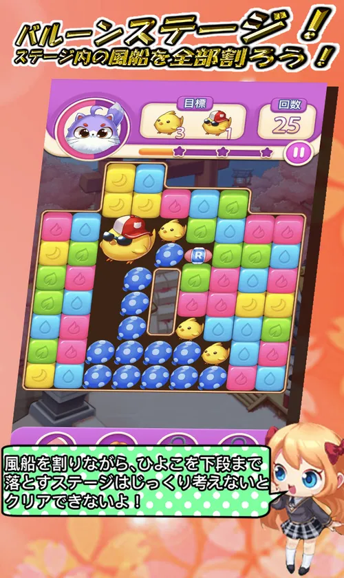 最初は簡単なステージを用意してあるので誰でも楽しく遊べて簡単にクリアできて、すぐに慣れます!慣れて来るとバルーンやバブルなどの特殊ブロックが登場するので頭を使ってクリアしていこう!