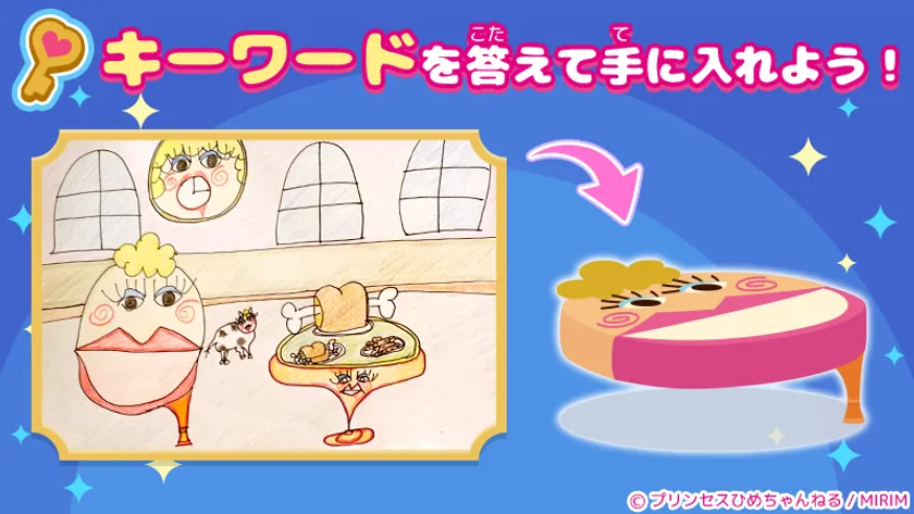 YouTubeチャンネル「プリンセス姫スイートTV Princess Hime Suite TV」から配信されている動画( https://www.youtube.com/watch?v=QdH-t1aK2kM )にて公開されたキーワードをアプリのキーワード入力フォームに入力することで、同チャンネル内で公開されている動画シリーズ「プリ姫人形劇」の『パパ子城のベッド』を描きおこしたアイテムが獲得できます。