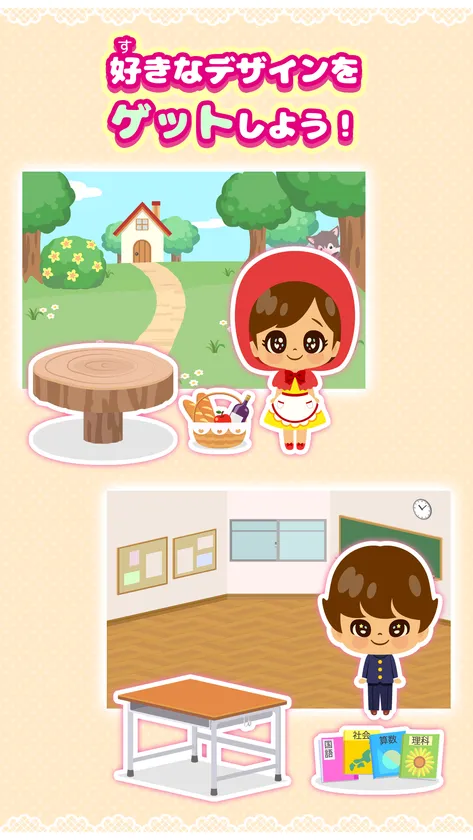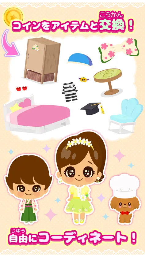ピースを3つ以上繋げて消す3マッチパズルをクリアすることで獲得できるコインを衣装・家具アイテムと交換し、「ひめちゃん」「おうくん」「こちょ」のキャラクターアバターやお部屋全体をコーディネートすることができます。