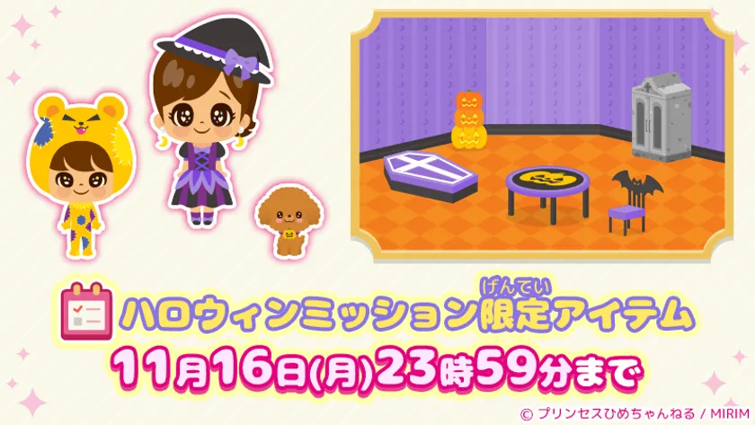 ハロウィンデザインの衣装・家具アイテム1つごとに異なる1つのミッションが割り振られており、1つミッションをクリアすると対応するアイテムが1つ開放されます。ハロウィンデザインの衣装・家具が開放できるのは開催期間中となります。