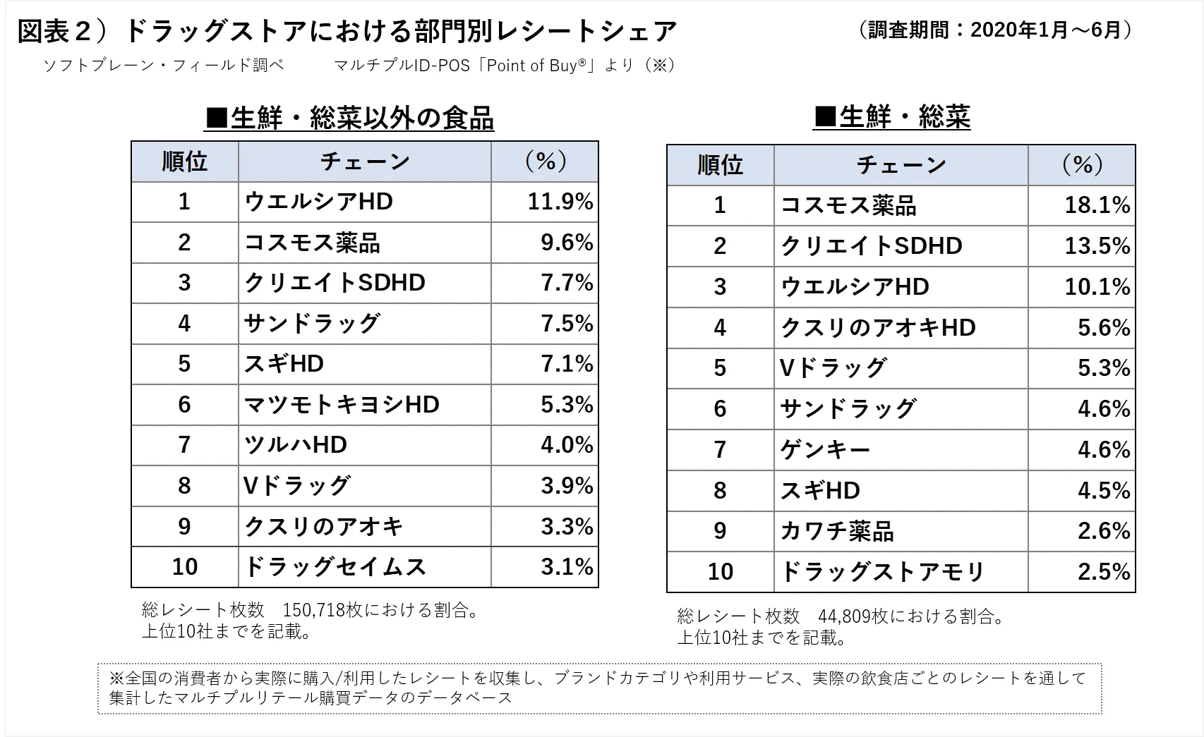 今までの分析結果をまとめると、2019年ドラッグストア売上ランキング5社のレシートにおいて、19年下期と20年上期を比較すると、部門別構成比は、各社「食品部門(生鮮・総菜含む)」が、増加傾向で、唯一コスモス薬品のみ、およそ4割を超えていました。食品構成比を高めにし、医薬品や化粧品などの構成比を低めに抑える売り方や、郊外立地の戦略が、コロナ禍でも日常的な集客に寄与し、好調であったと考えられます。