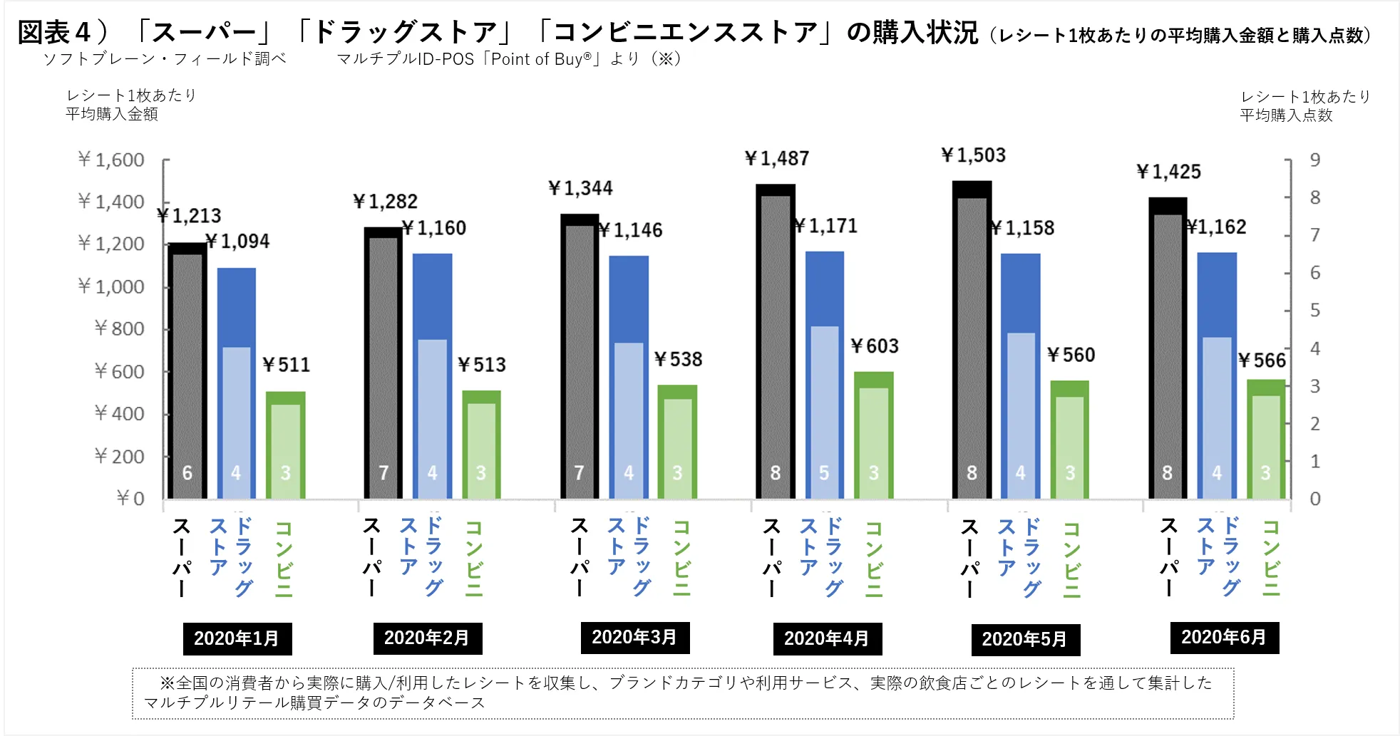 次に、「スーパー」「ドラッグストア」「コンビニエンスストア」の3業態をセレクトし、購入状況(レシート1枚あたり、平均購入金額および購入点数)を分析しました。(調査期間:2020年1月~6月、スーパー、ドラッグストア、コンビニエンスストアのレシート総枚数 約320万枚 )