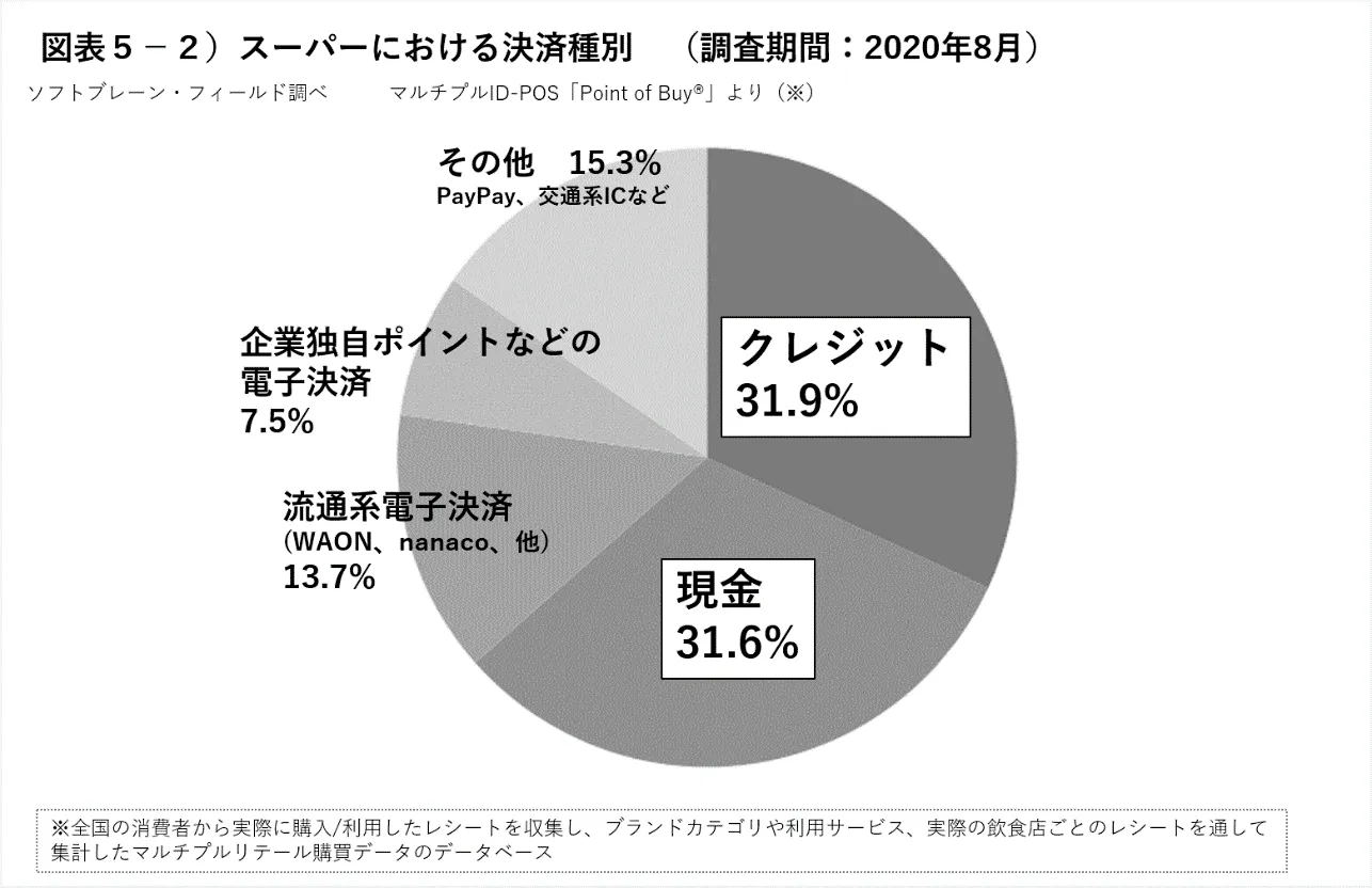 そうなった場合、現金以外のキャッシュレス決済方法が、クレジットカードや流通系電子決済が多くを占めるスーパーよりもドラッグストアのほうに優位性があると言えるのではないでしょうか。(図表5-2参照)