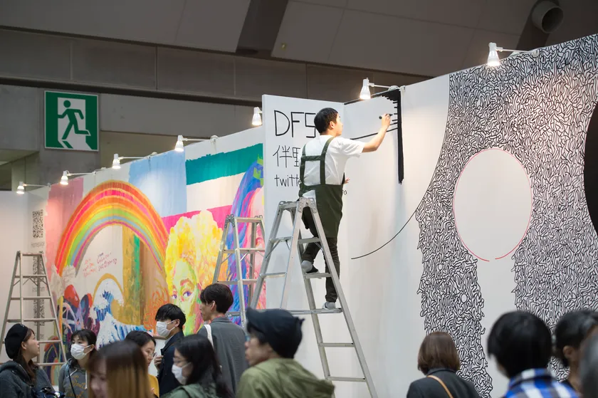 通常ブースだけでなく会場の照明を落とした「暗いエリア」をはじめ、2日間にわたり作品を作り上げる「ライブペイントエリア」や、高さ3.6mの「巨大ライブペイントエリア」などデザフェスならではの出展も充実しており、間近でアーティストの創作活動を見ることができます。