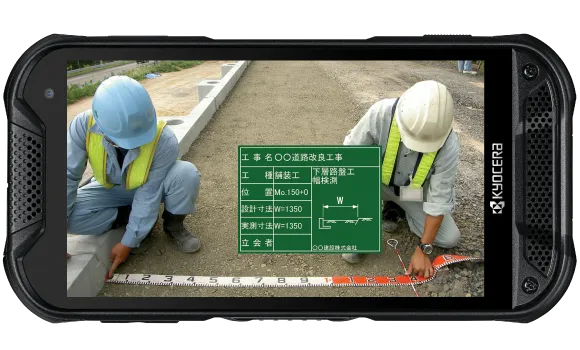 今回、「DuraForce PRO 2」では、当社と各アプリベンダー様との協業により、各社が展開する電子小黒板アプリへの対応が可能となりました。以下のアプリは、それぞれ建設現場、工事現場などに適した機能を持ち、従来、作業者が手書きで黒板に書き込んでいた施工内容を電子化し、現場状況を撮影することで、現場労力の省力化と管理業務の効率化を図ることができます。