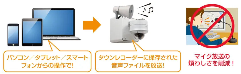 タウンレコーダーにあらかじめ保存しておいた音声ファイルの音源を、お持ちのWindowsパソコン・タブレット端末やスマートフォンでのボタン選択操作で再生するだけでアナウンス放送ができます。例え緊急時であろうと、発信者のスキルを問わず、迅速、かつ確実な情報伝達が可能となります。