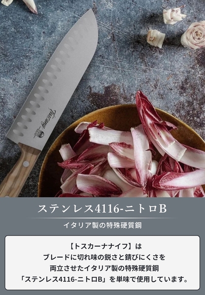 【トスカーナナイフ】はブレードに切れ味の鋭さと錆びにくさを両立させたイタリア製の特殊硬質鋼「ステンレス4116-ニトロB」を単味で使用しています。