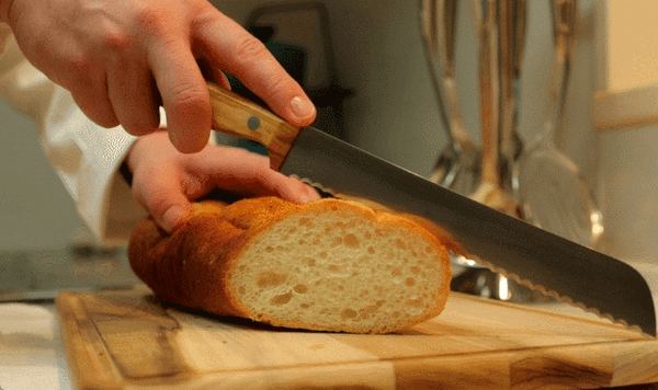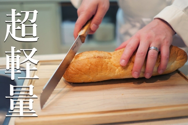 一般の包丁では切っている間にパンクズが出やすいバケットのカットも、切れ味が良い【トスカーナナイフ】のブレッドナイフなら、軽く一回引くだけ。
