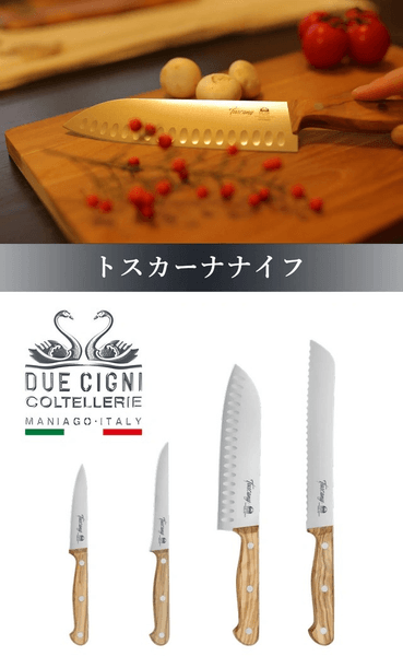 【トスカーナナイフ】はイタリアの刃物の街マニアーゴの老舗刃物メーカー、Due Cigni社が作り上げた極上の切れ味と扱いやすさを併せ持つキッチンナイフです。