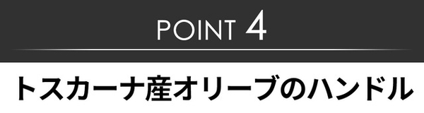 ハンドルに木目の美しいトスカーナ産オリーブを採用。軽くて持ちやすく手首や腕の負担も軽減