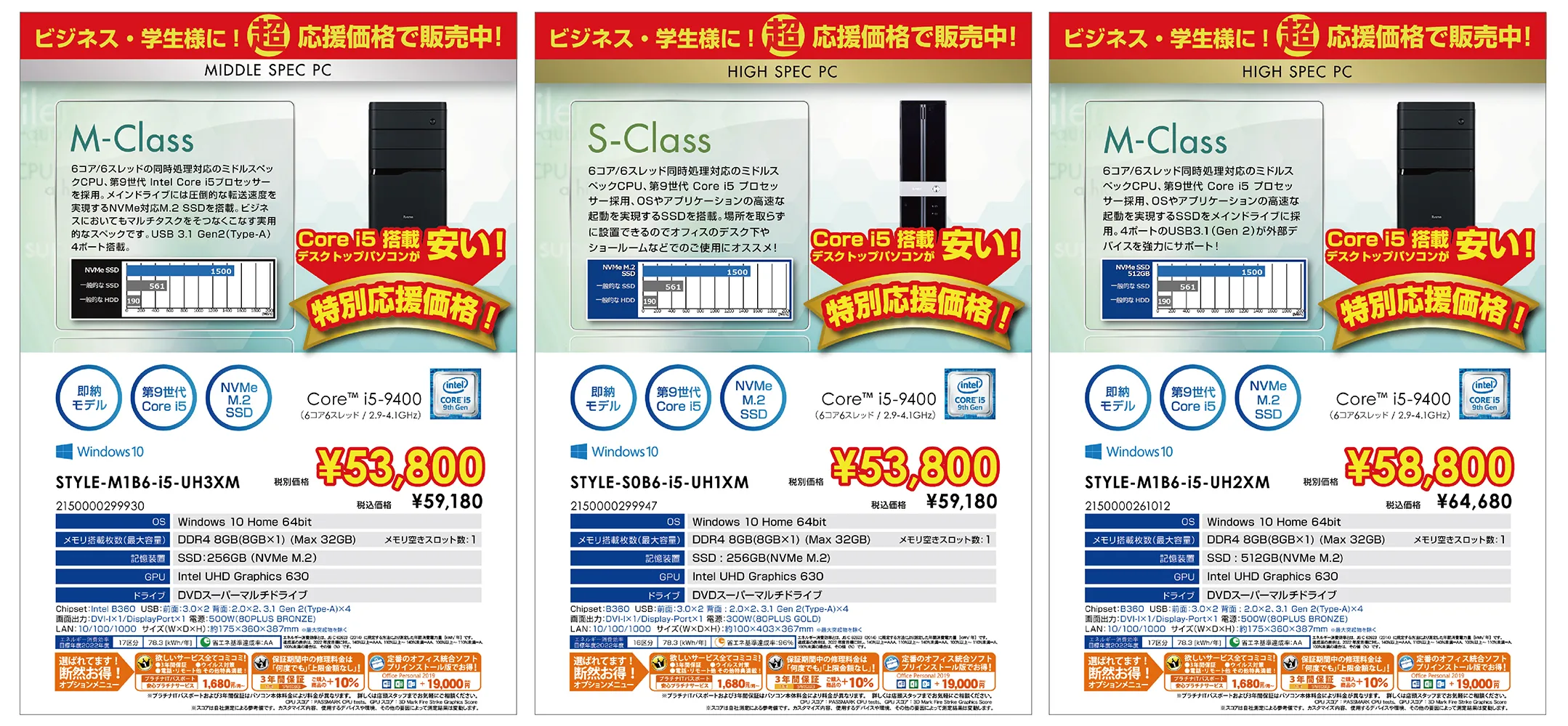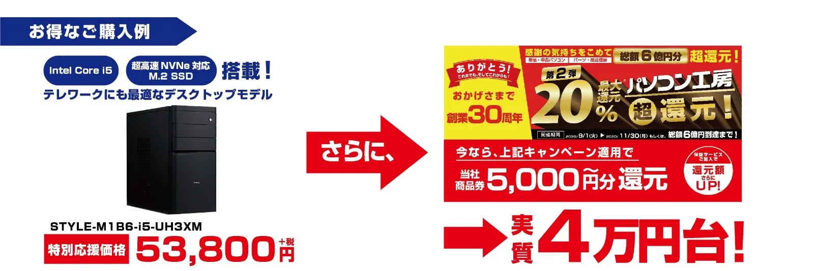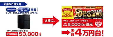 例えば、Core i5搭載 & 超高速 MVNe対応M.2 SSD 搭載の「特別応援価格」53,800円(税別)のデスクトップPCをご購入いただくと、今なら「総額6億円分 最大20%超還元!第2弾」のキャンペーン適用で、当社商品券5,000円分を還元。実質4万円台(税別)でお求めいただくことが可能です。