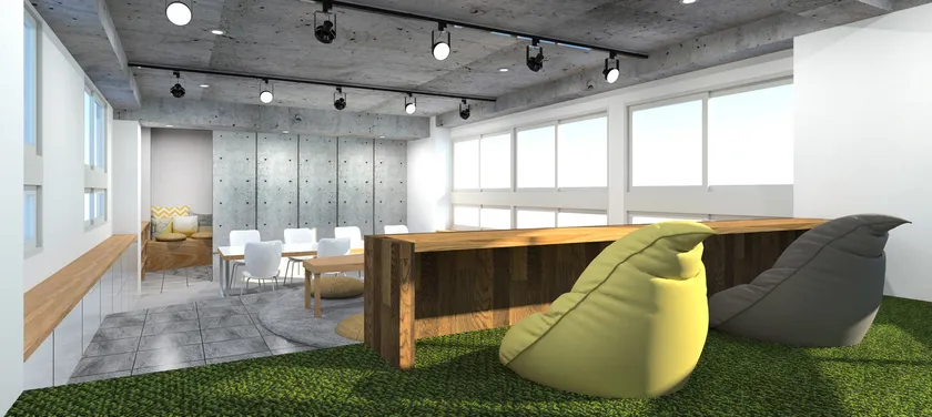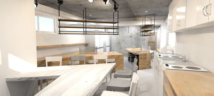2棟42室の大型シェアハウスには、3段式の立体的なリビングや4名が同時調理可能な大型ダイニングキッチンを設置。コワーキングスペース、24時間利用可能なフィットネスルームを併設し、無料のオンライン英会話で英語学習も可能です。