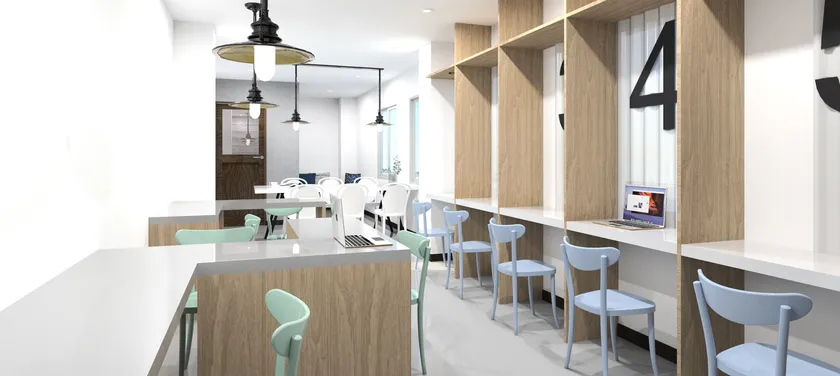 オープンスペースを12席、左右が仕切られた「集中ブース」が6席、「ミーティングルーム」を3室完備。その日の気分や目的に合わせて、場所を変えることができます。ミーティングルームにはWEB会議やYoutube撮影にも便利なWEBカメラ、マイク、LED照明、グリーンバックスクリーン等を用意しております。コワーキングスペースは月額会員制で、シェアハウスの入居者以外にも利用可能です。住宅街のワークスペースとしての需要も獲得していきます。