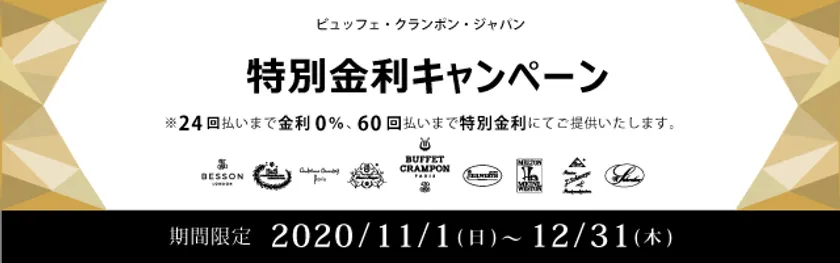 管楽器製造のリーディングカンパニー、ビュッフェ・クランポン グループの日本現地法人である株式会社 ビュッフェ・クランポン・ジャパン(本社:東京都江東区東陽、代表取締役社長:長手 健)は、2020年11月1日(日)より12月31日(木)までの期間、楽器を購入されるお客様の分割手数料が最大24回払いまで無料、30回~60回払いの場合は特別金利になる「ビュッフェ・クランポン・ジャパン特別金利キャンペーン」を、全国公認特約店にて実施致します。
