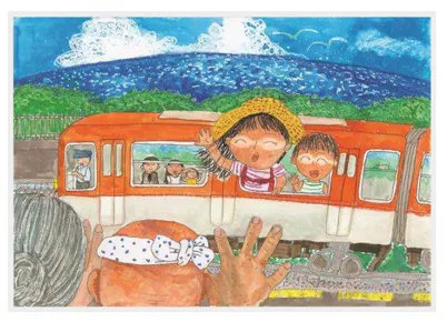 受賞のポイント:題名は【「またくるね」阪神電車で】手を振り見送る、おばあちゃんとおじいちゃん。海で思いっきり遊んだんだろうな…水中メガネの日焼け跡もしっかりついています。電車内の人たちも運転手さんもみんな笑顔で描いてくれ、本当に楽しかったんだろうなぁ。と感じさせてくれる素敵な絵画です。一枚の絵の中に物語をしっかり描き表現してくれた、The「ぼくとわたしの阪神電車」です。