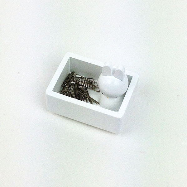 まずは、クリップホルダーのご紹介です。ケースの中に、マグネット仕様のミッフィーが待機中。クリップの保管場所としてお使いいただけます。サイズは60×70×50mmのコンパクトサイズなので、邪魔になりません。