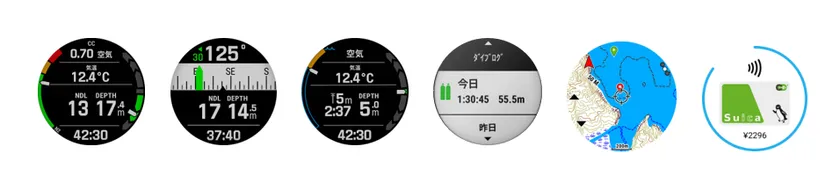 メインダイブ画面/水中3軸電子コンパス/セーフティモード/潜水データ記録/フルカラーマップ/Suica